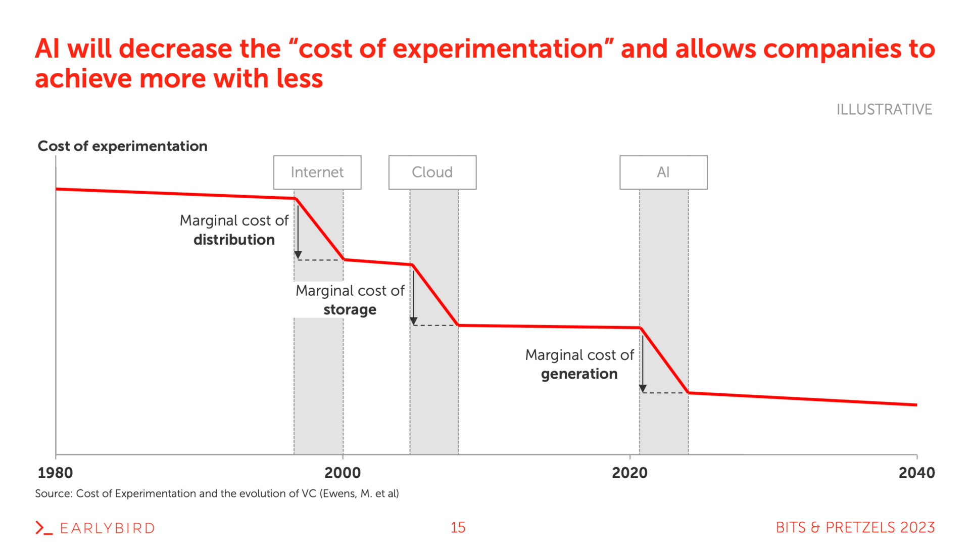 The cost of experimentation is defined as the resources required to achieve a specific milestone, e.g. product-market fit or 1M ARR. Ewens, Nanda, and Rhodes-Kropf wrote an interesting paper in 2018 about the impact of technological platform shifts on the cost of experimentation. More generally they find that technological innovation allows companies to achieve more with less. This applies to AI too.