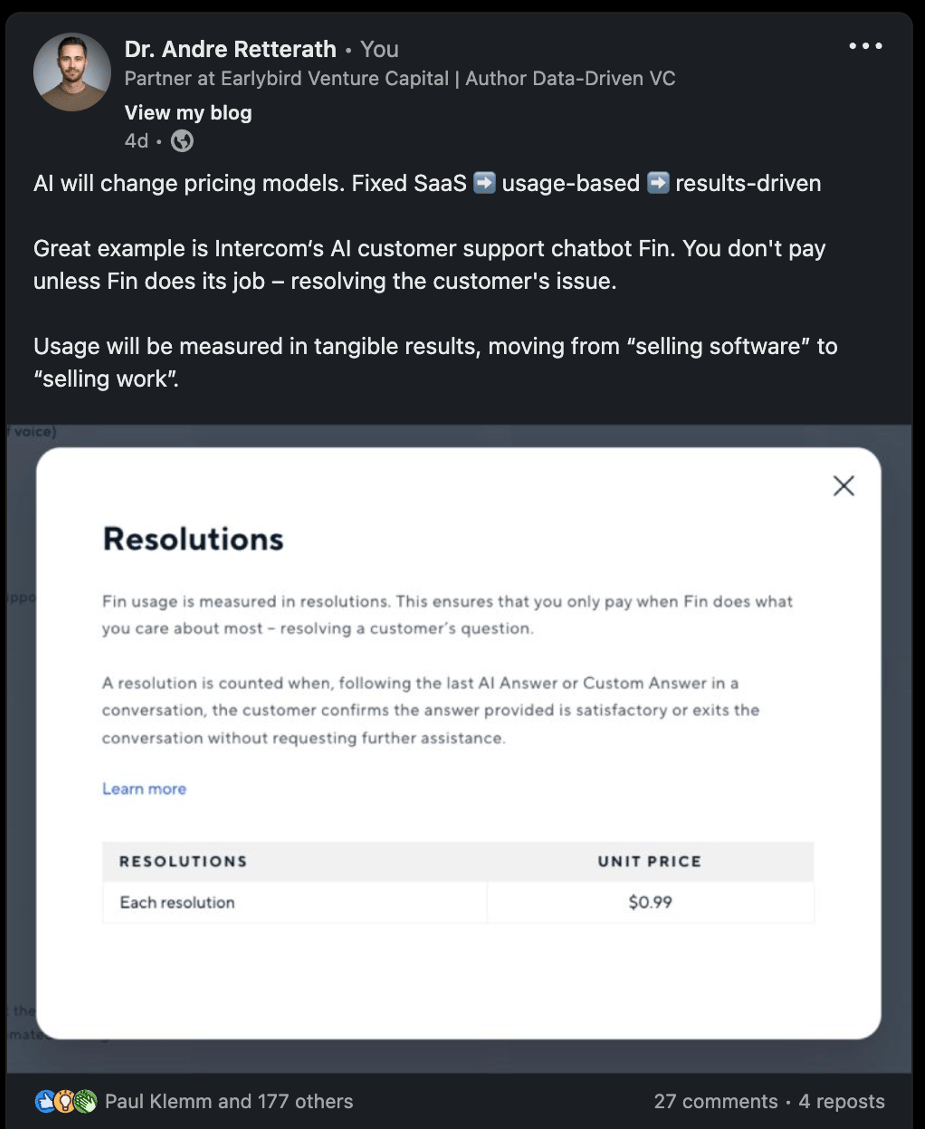 In line with the business model shift above, I expect pricing models to adapt too. While we historically moved from fixed licenses to more flexible SaaS and from SaaS to usage-based models, I believe that AI solutions should be less input-driven (yes, companies should be able to pay their compute bills..) but more output-driven. Hereof, I expect that we’ll soon move from usage-based to result-based pricing.
