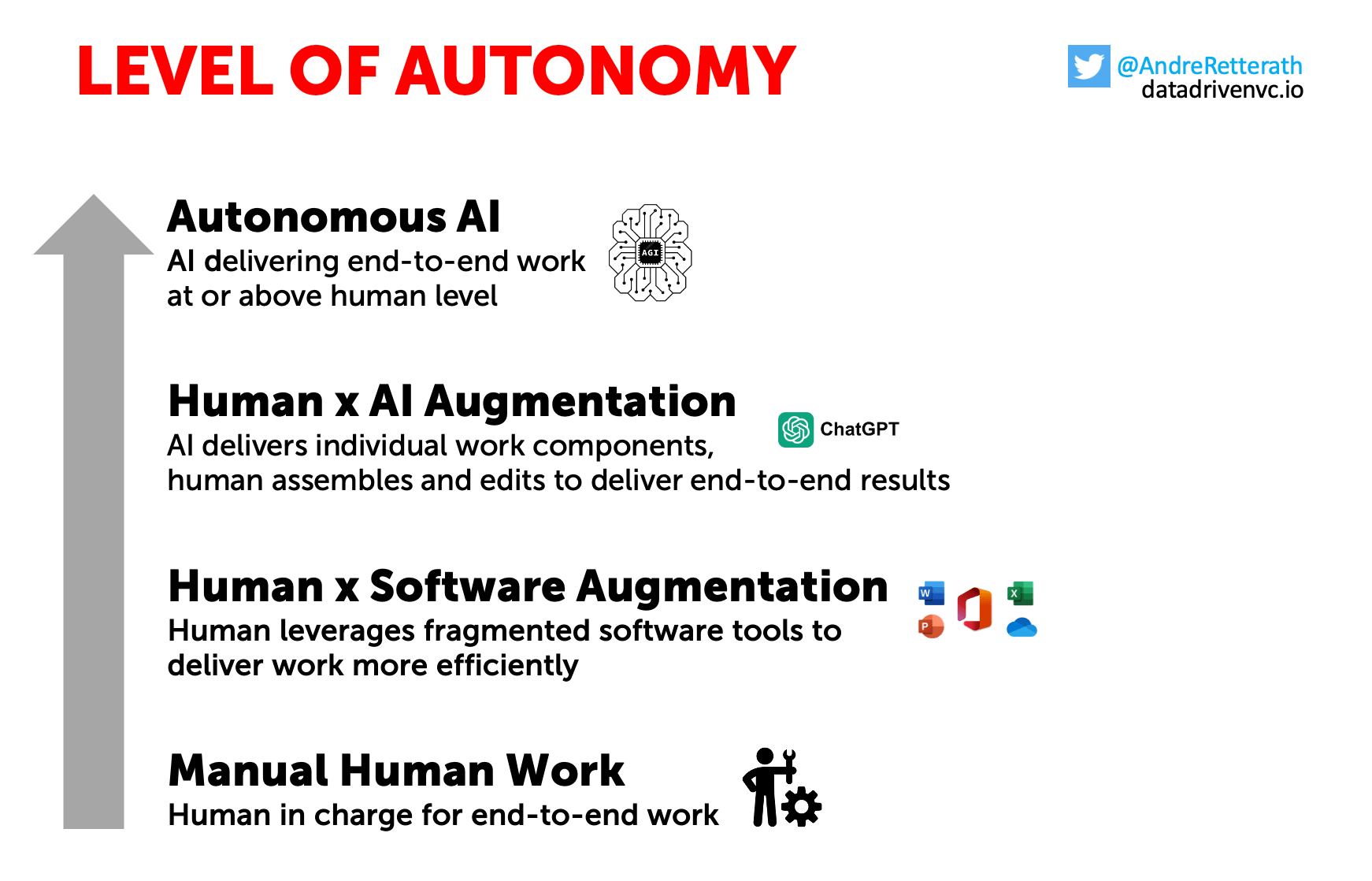 Human x Software Augmentation: Looking at modern humanity, we moved from manual work supported by physical tools to software-augmented setups in the early 1980s. Software augmented means that the human worker is still in full control of both the individual work components but also the overall end-to-end result but leverages software to get more done with less.