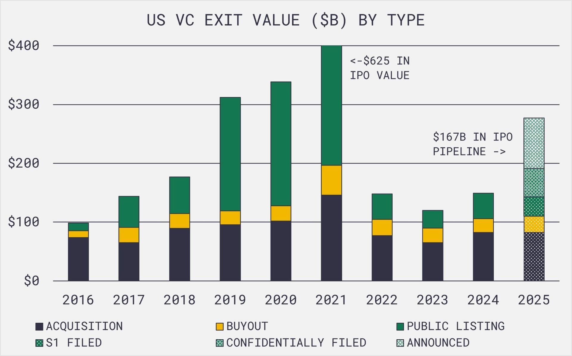 Capital Lock-Up: Three years of depressed exit values echo early 2010s levels, even though a surge of capital flowed during 2020–2022, resulting in over 800 unicorns still waiting for an exit.