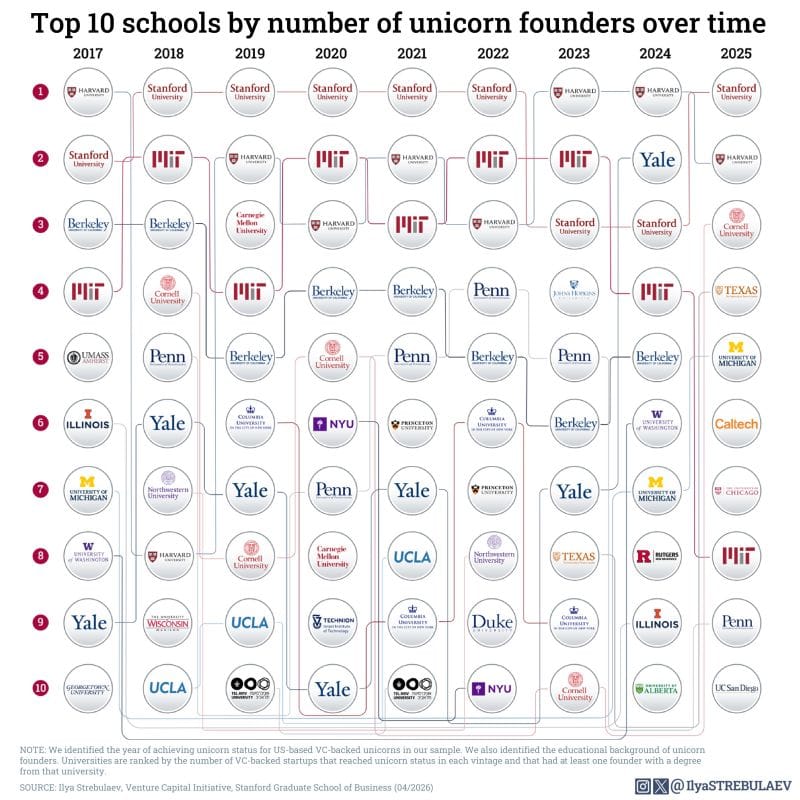Ilya Strebulaev from Stanford shared expanded rankings of universities behind US unicorn founders, now covering the top 10 schools across nine annual vintages from 2017 to 2025.
