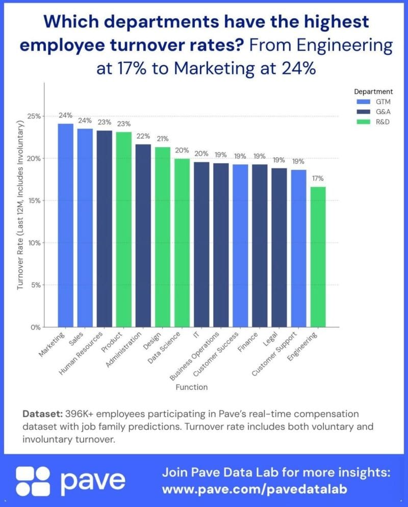 Pave recommends using these benchmarks to audit retention by department, identify whether turnover is concentrated in high-performers, and adjust compensation strategies accordingly: If a company's engineering turnover is above 17% or sales turnover is below 24%, it may signal either a compensation misalignment or a cultural issue worth investigating.