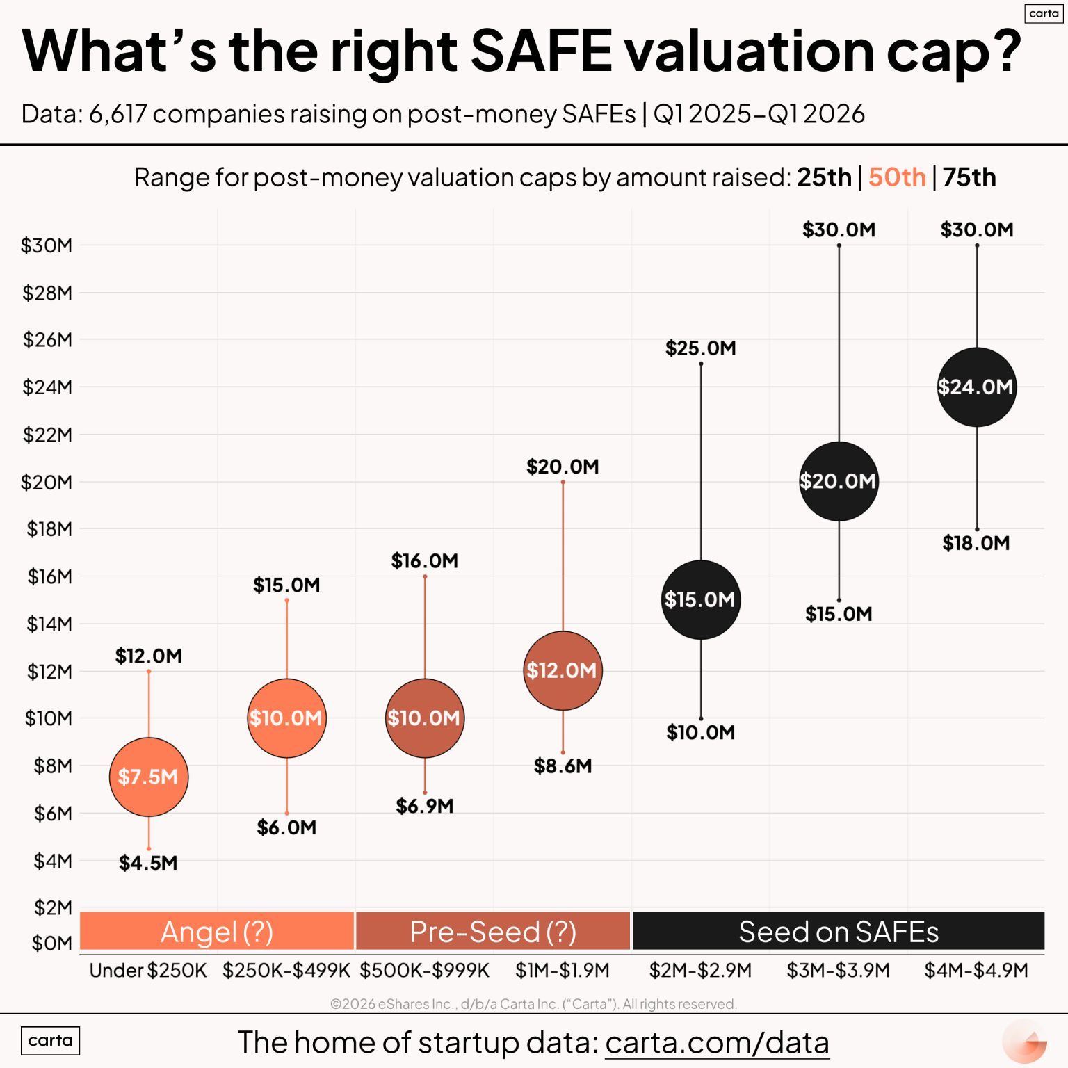 Peter Walker (Head of Insights at Carta) shared data showing the enormous variance in valuation caps for post-money SAFEs at every round size, arguing that anyone claiming there is a "right" number is lying.