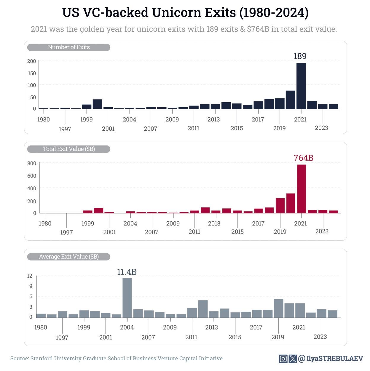 Historical Context: Across 40+ years, 738 unicorns have exited, averaging $3.2B per exit, with 2019’s $5.4B yearly average exit value remaining a standout.