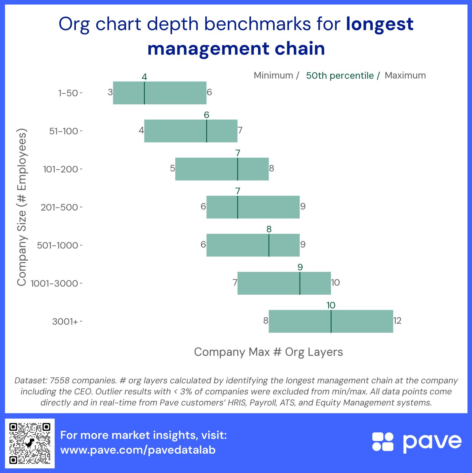 Org Chart Benchmarks: At 1-50 employees, companies average 4 layers (median), while larger organizations (3,001+ employees) average 10 layers. The progression shows a clear trend of increasing hierarchy as companies scale.