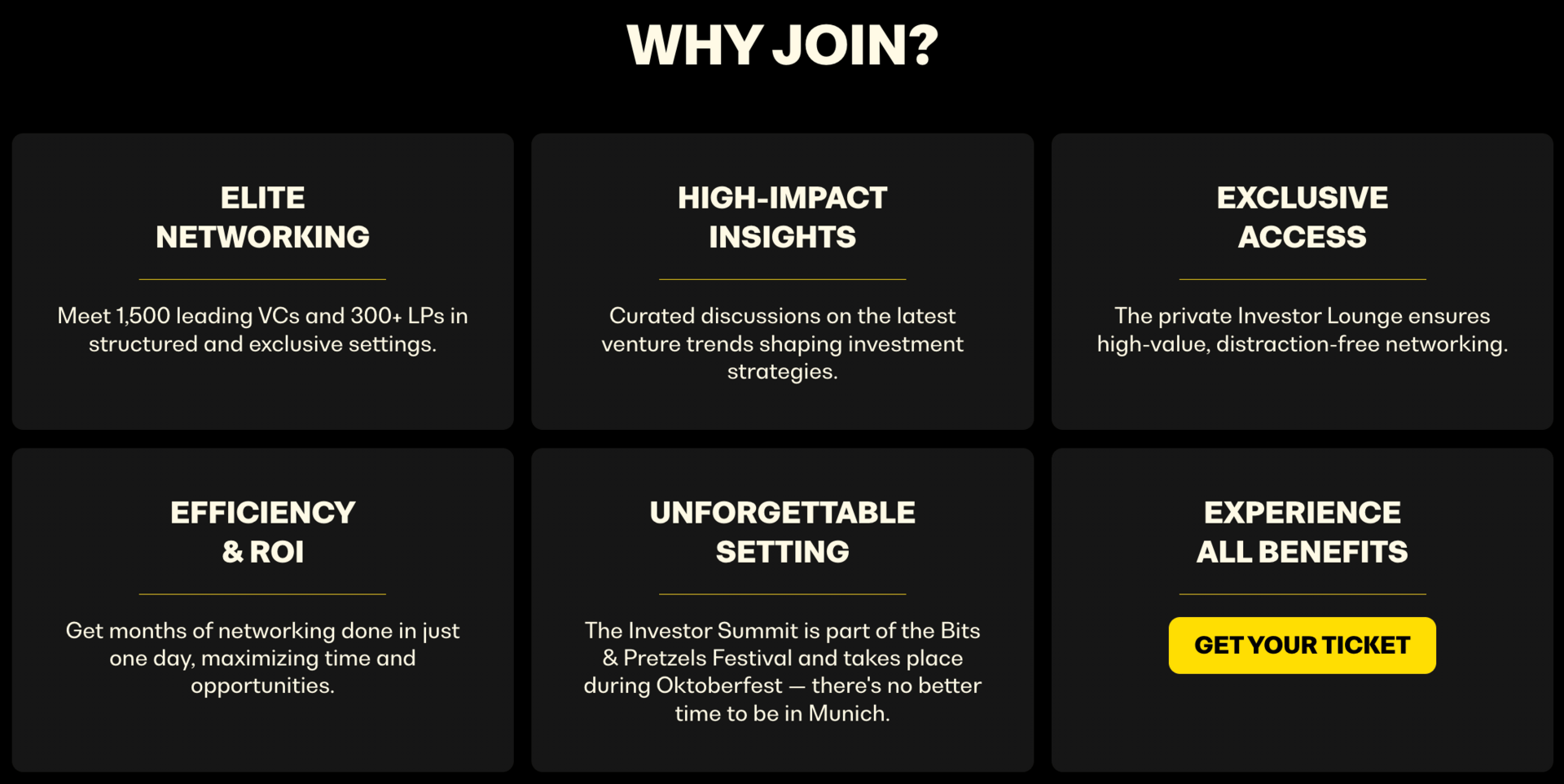 In a collaboration between Data Driven VC and Bits & Pretzels, we aim to make the *Investor Summit 2025* the premier event for international GPs & LPs to meet alongside the one and only Oktoberfest.