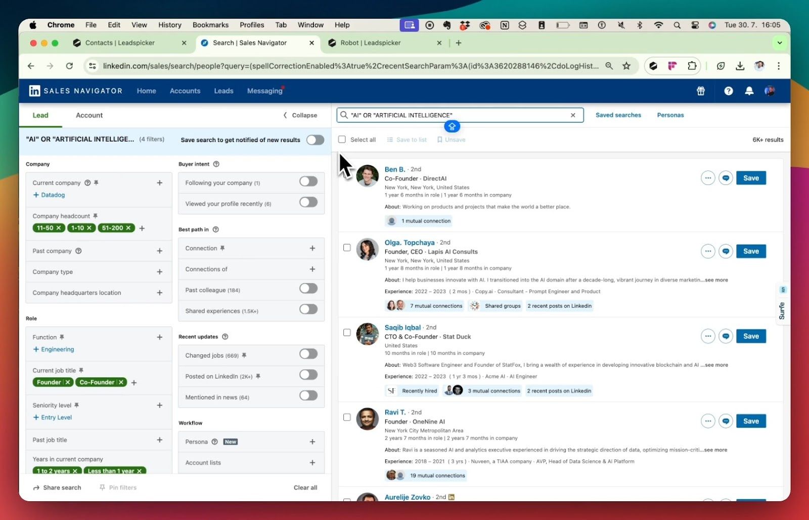 To achieve this, we utilized basic search filters in Sales Navigator and employed a boolean query “AI” OR “Artificial Intelligence” to further narrow down the search for our specific purpose.
