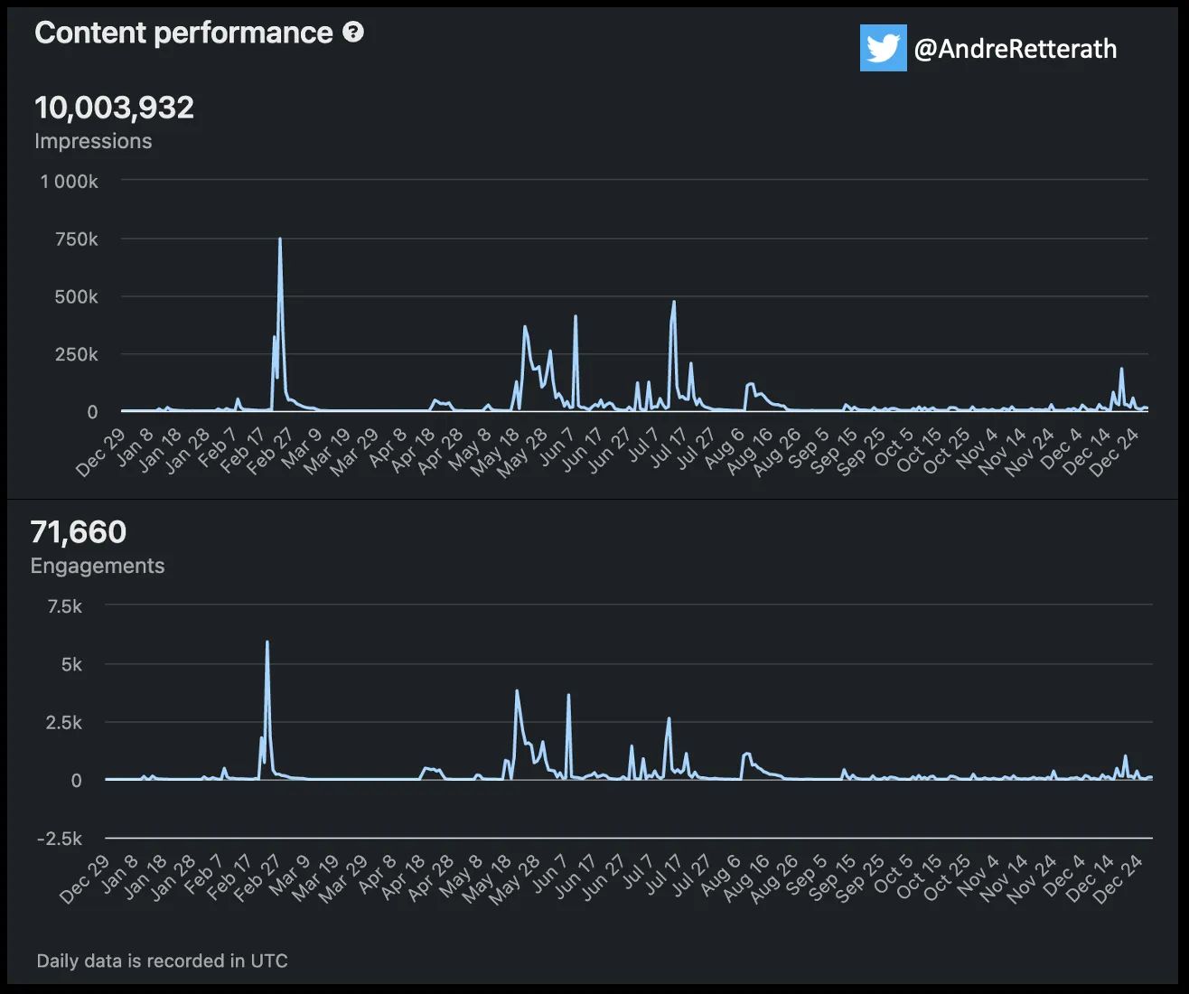 On the distribution side, I joined LinkedIn in July 2016 and have grown my audience to about 25k followers with 10M+ annual post views and 70k+ annual engagements in 2022. One interesting learning I’d like to share: Up until August 2022, I shared mostly external content for a broader audience (tech, VC, startups, productivity) and insights from my day-to-day that I found potentially useful to others. Starting in September, I strictly narrowed my focus to AI and data-driven VC, and shifted from mostly external to mostly my own content.