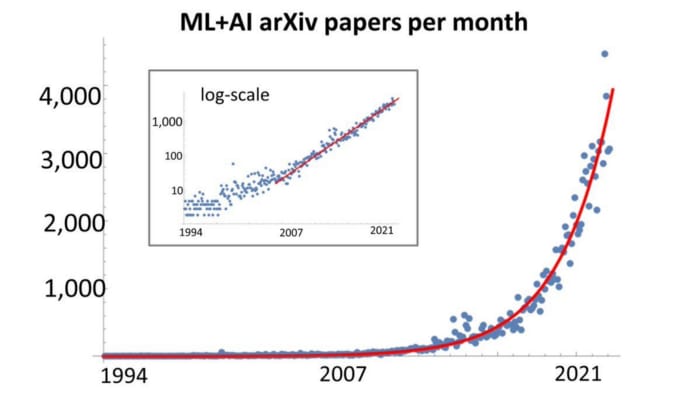 Through these cycles, there was a gradual shift from scholarly publications and academia to private investment from commercially oriented organizations. The preceding decade saw the formation of several research labs from both incumbents (e.g. Google, Meta) and startups (e.g. OpenAI), each mobilizing vast compute and data resources to advancing ML; the inflection in research papers that followed is clear to see.
