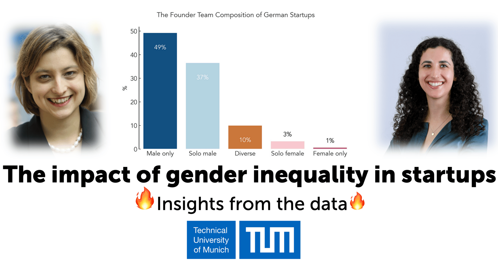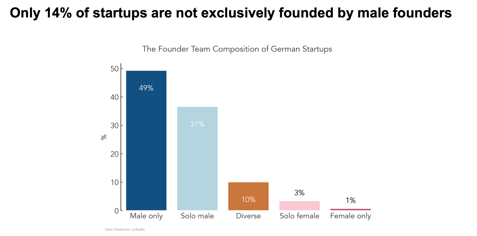 Despite the fact that women make up more than half of the world's population, they continue to be significantly underrepresented in entrepreneurship, where starting a new venture has long been dominated by men. Our analyses show that 86% of German startups are founded by all-male teams or solo male founders, while solo female founders or all-female founding teams remain the exception.