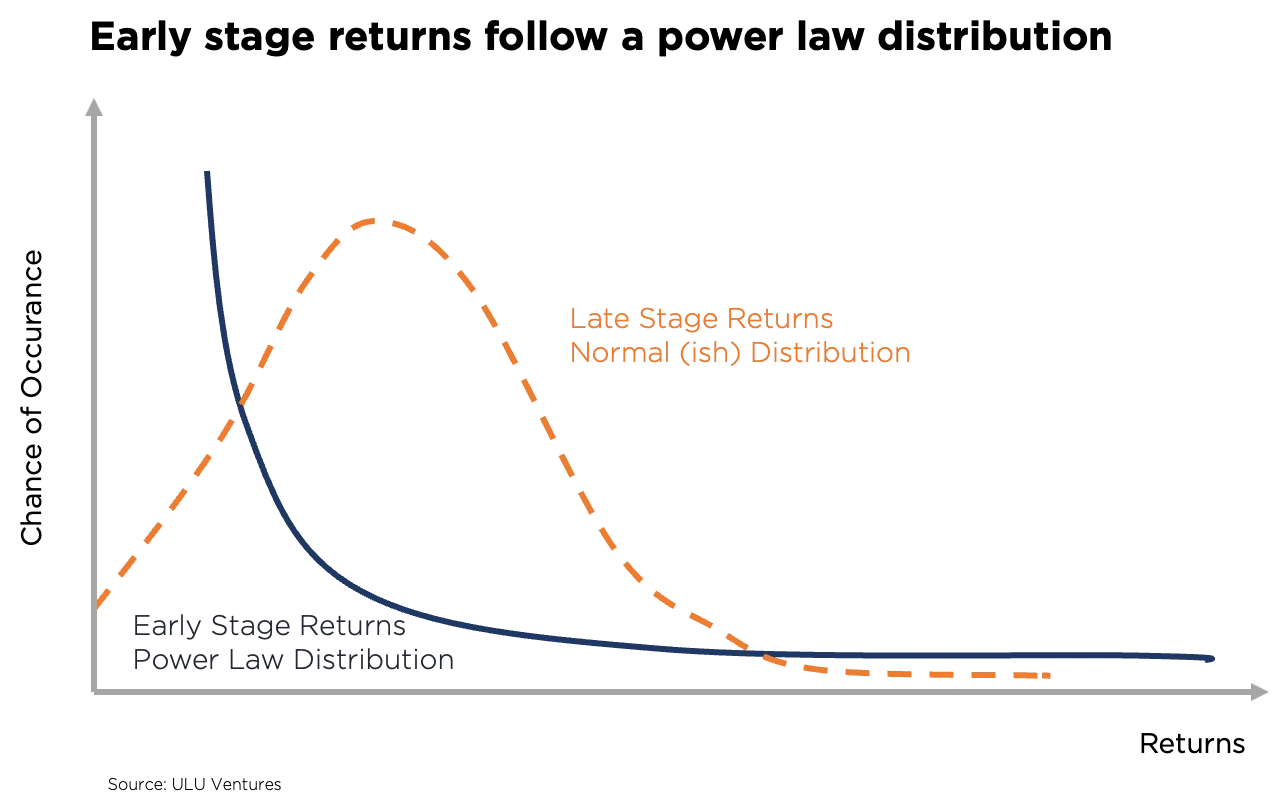 Return distributions of early-stage VC (Power-law) versus late-stage VC (Normal)
