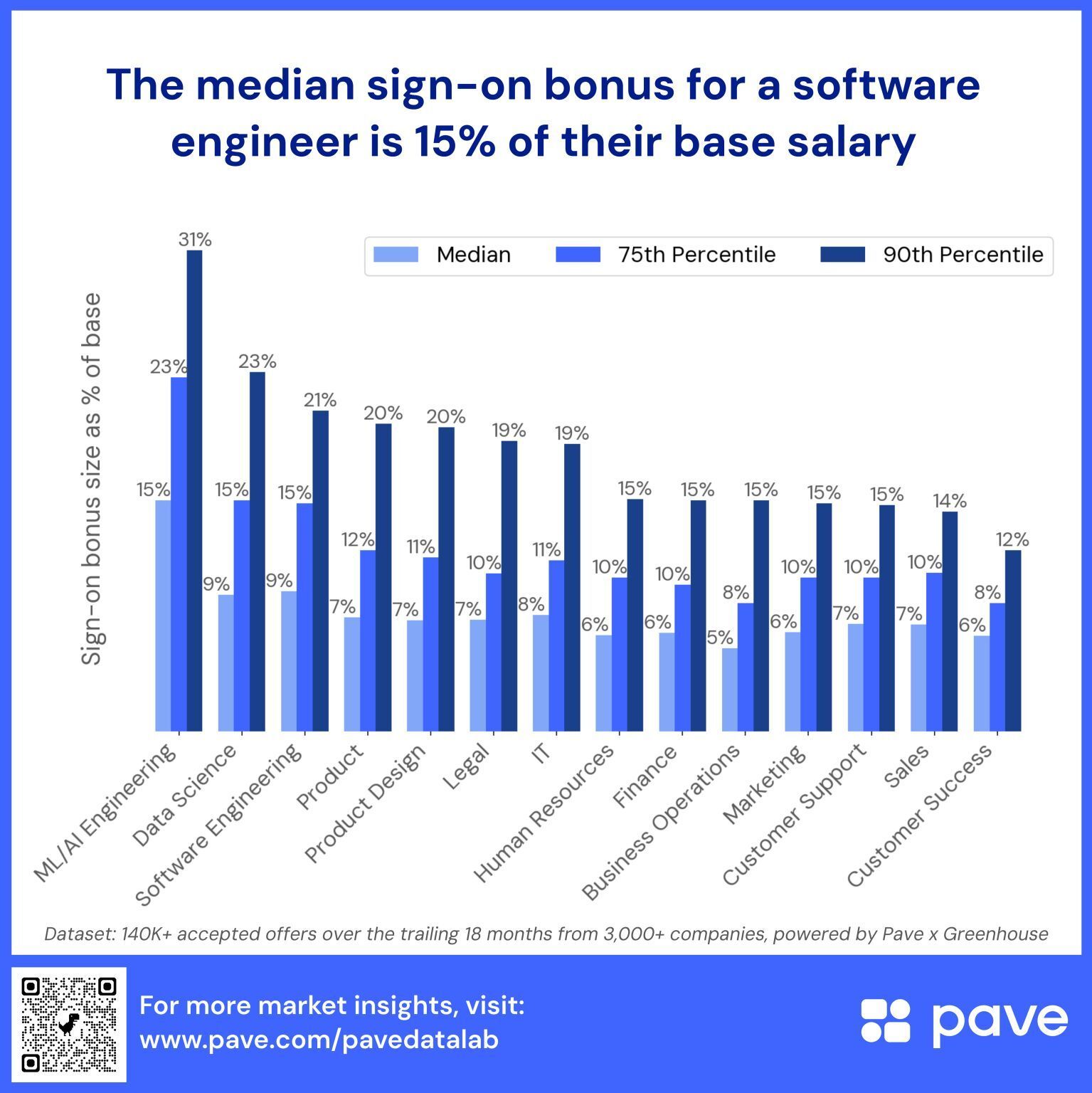 Sign-on bonuses are common perks for luring top talent, but their size varies significantly across job roles. According to an analysis by Matt Schulmann For software engineers, the median sign-on bonus is 15% of base salary, while other functions hover below 10%. AI/ML roles stand out as highly competitive, with bonuses soaring at the higher percentiles.