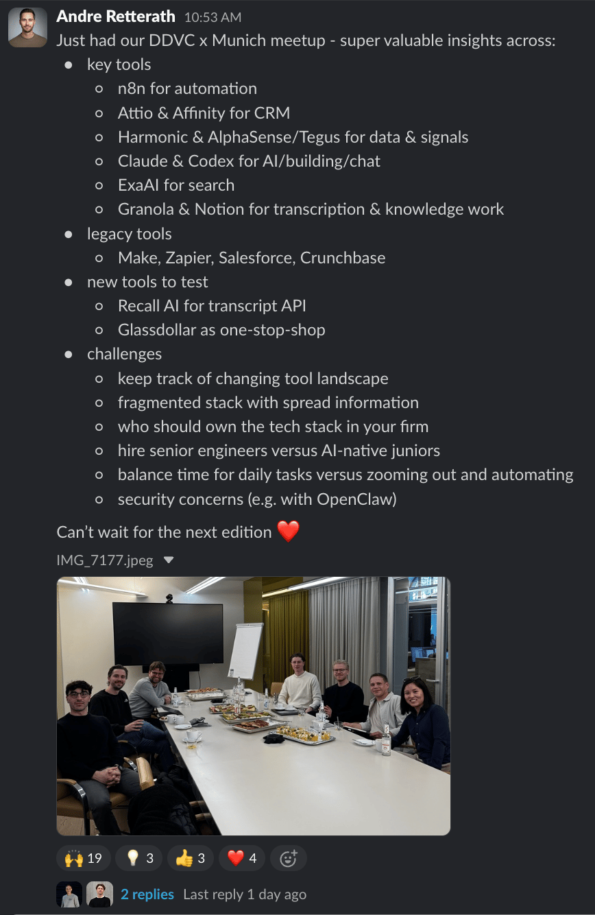 Earlier this week, I hosted the smallest meetup I've ever run: eight members from our DDVC Slack group, two hours, and one table in our Munich office.