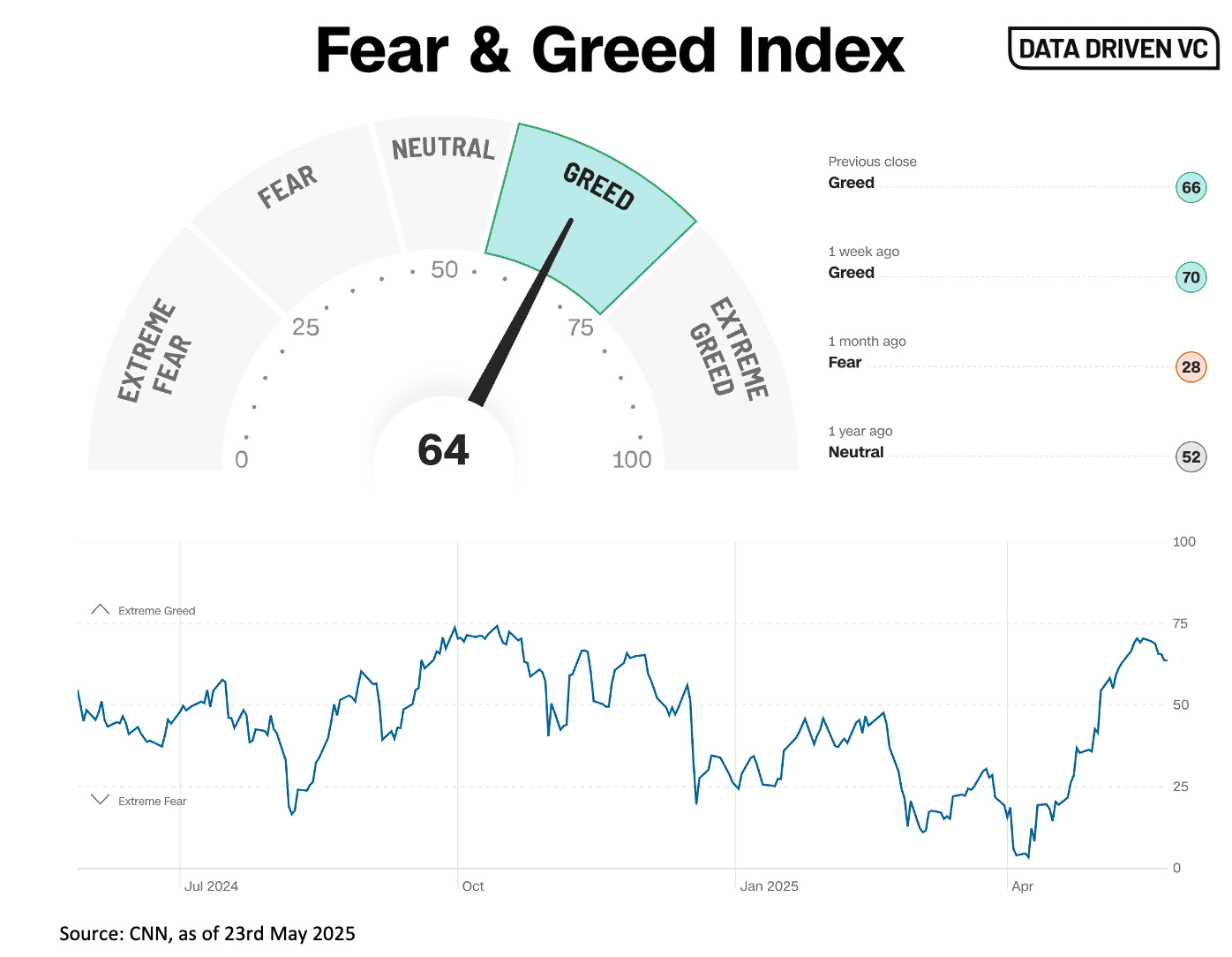 On a scale of 0 = extreme fear to 100 = extreme greed, we’re currently at a 64 with a strong upward trend, coming from just 35 last month.