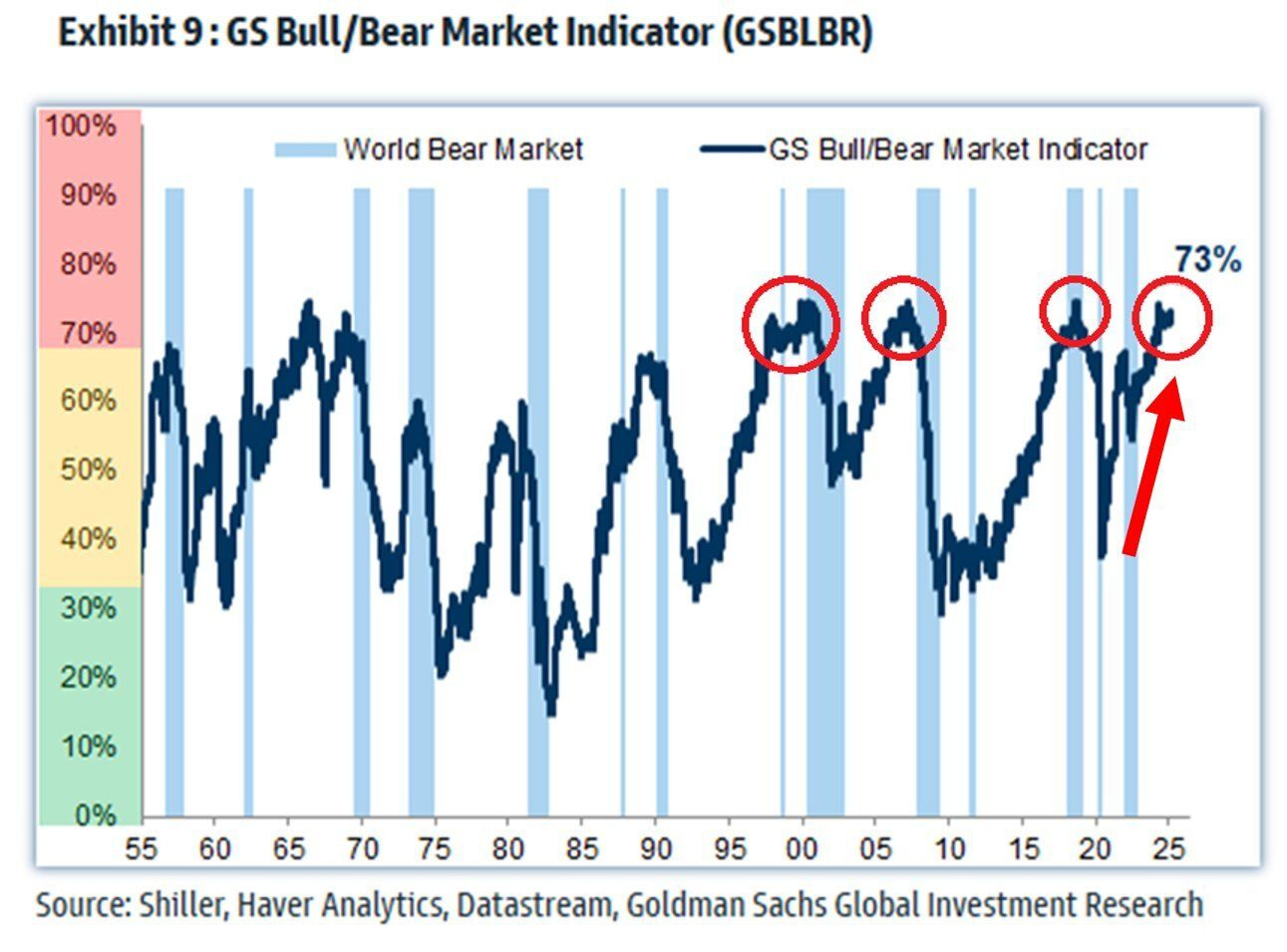 On a scale of 0% = bullish to 100% bearish, the GSBLBR Indicator has climbed to 73%, a further 3% increase compared to last month, putting it at a historically high level that often signals caution for investors.