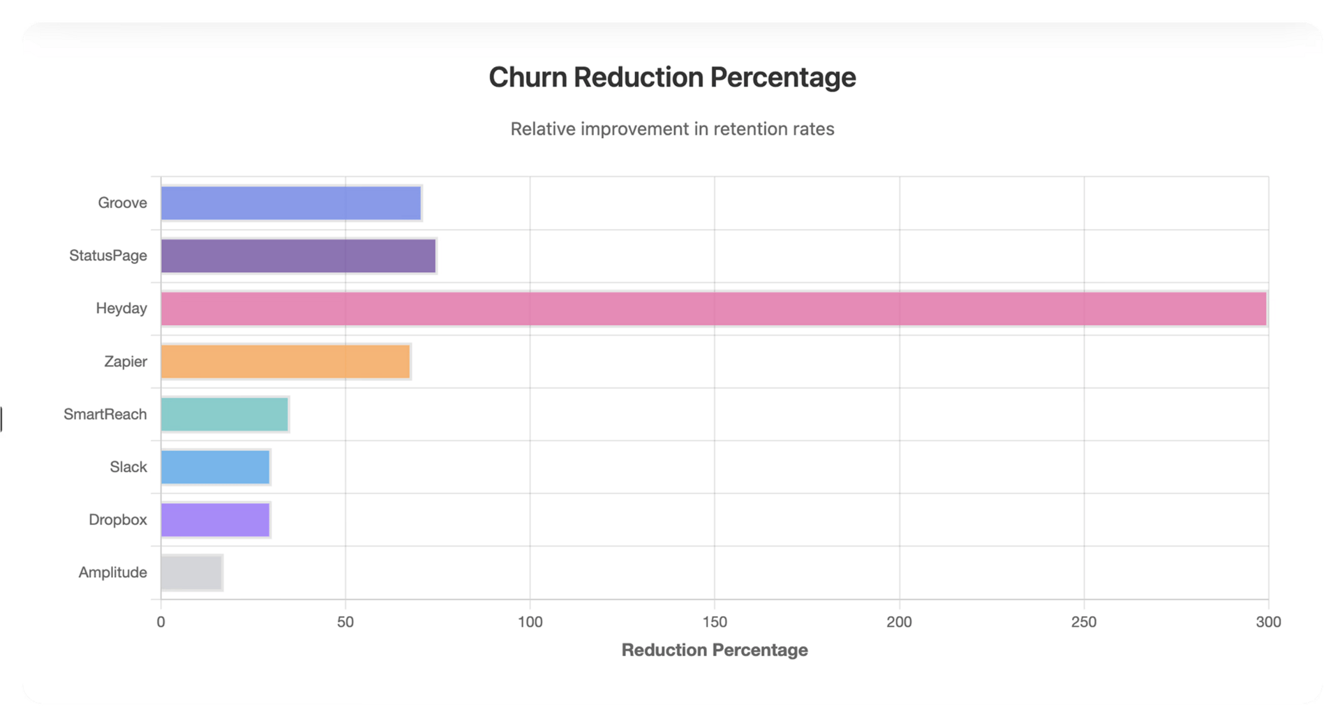 A structured churn-reduction process that unifies customer signals, models risk, identifies root causes, and triggers targeted actions consistently drives results. Cases like Groove’s 71% churn drop and Slack’s roughly 30% trial improvement show how predictive alerts plus timely fixes boost retention. The strongest gains come from pairing data insights with quick and impactful product and customer-team interventions.