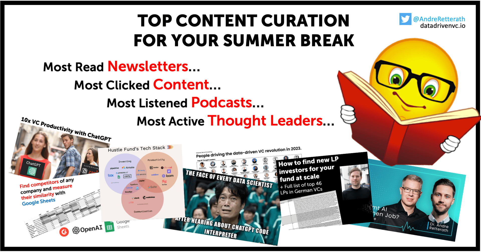 So here it comes, the Data-driven VC Content Curation to fuel the remainder of your summer break. It contains the most-read DDVC episodes from the first seven months of 2023, the most clicked links to external content, a collection of related podcasts, and links to Twitter and LinkedIn accounts of the most active DDVC Thought Leaders.