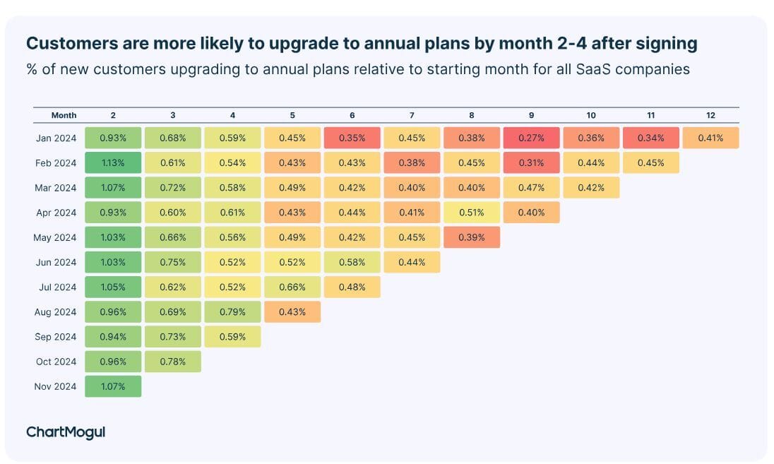 Kyle Poyar summarizes new data from ChartMogul, analyzing billing behaviour across 2,500+ SaaS companies. Contrary to popular belief, the best time to push for annual upgrades isn’t months down the line but within the first few weeks of onboarding.
