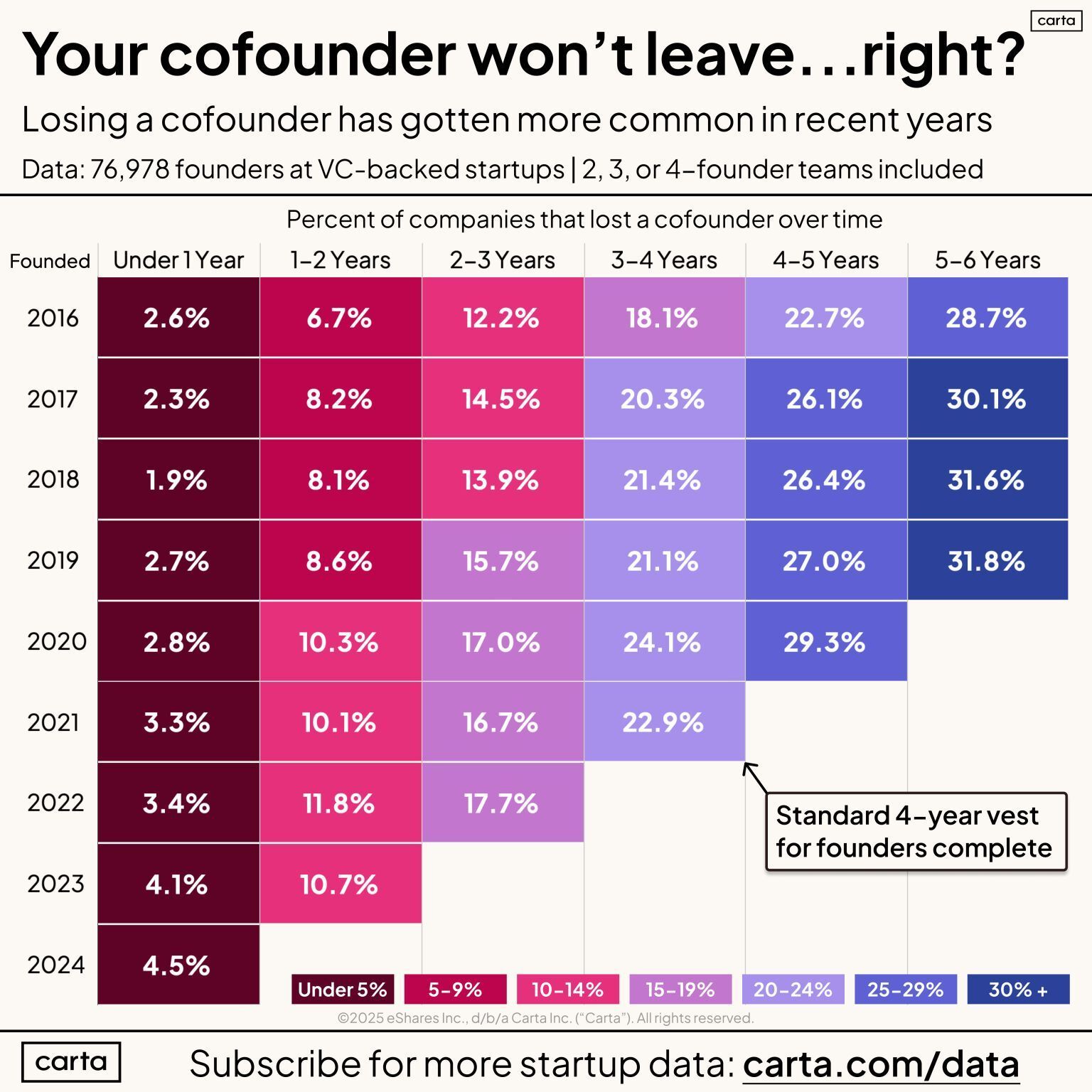 Peter Walker from Carta breaks down founder departure data from nearly 77,000 US startups founded between 2016 and 2024. His analysis excludes solo founders and focuses on VC- or angel-backed companies with SAFEs or Notes.