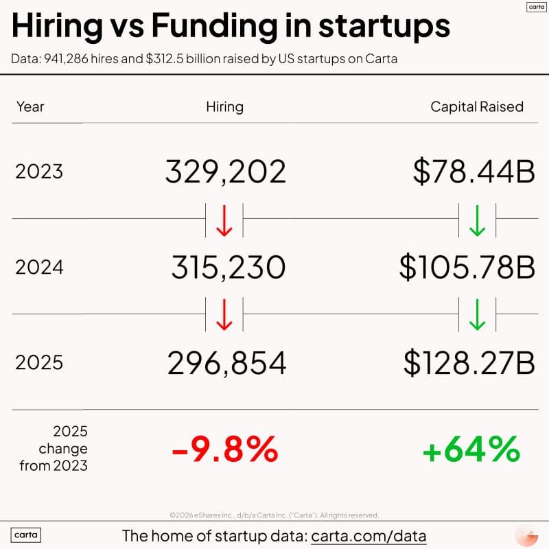 +64% Funding Growth vs. -9.8% Hiring Decline (2023–2025): Total capital raised by US startups on Carta climbed from $78.44B in 2023 to $128.27B in 2025, while total hires fell from 329,202 to 296,854 over the same period; marking the first time funding and hiring have moved in opposite directions at this scale.