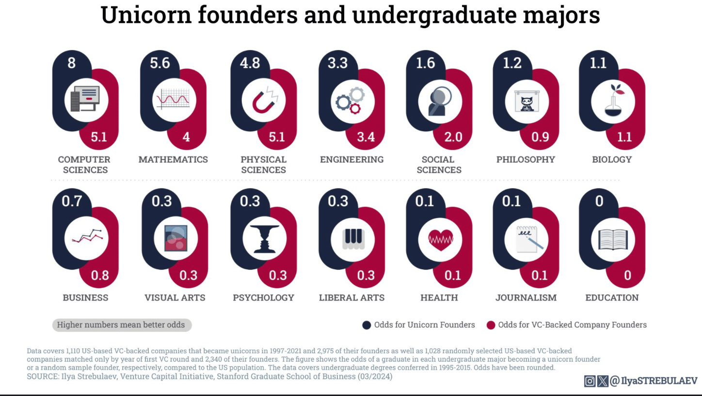 Computer Science Reigns Supreme: Majors in computer science are 8 times more likely to launch a unicorn compared to other US undergraduate majors and 5.1 times more likely than the average of all founders of VC-backed startups.